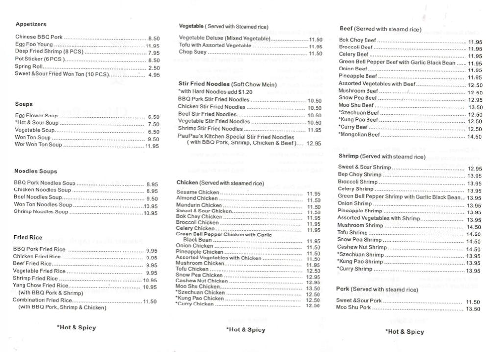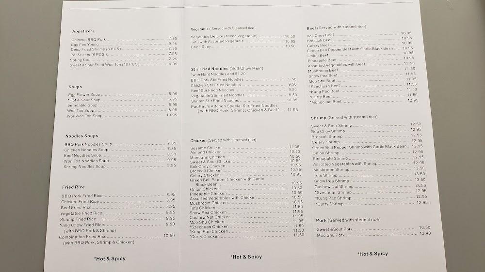 Paupau's Kitchen features a diverse menu with 93 dishes, showcasing traditional Chinese cuisine. The selections range from appetizers like Spring Rolls to hearty mains such as Sweet and Sour Chicken. Fried rice and noodle dishes are highlights, giving patrons plenty of flavorful choices. Vegetarian diners can also find various options to enjoy.