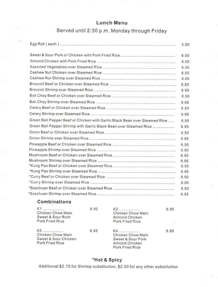 Lunch specials are popular, offering good value for money with options like Almond Chicken with Pork Fried Rice. The well-balanced flavors across all dishes and the emphasis on fresh ingredients mark this menu as both comforting and satisfying.