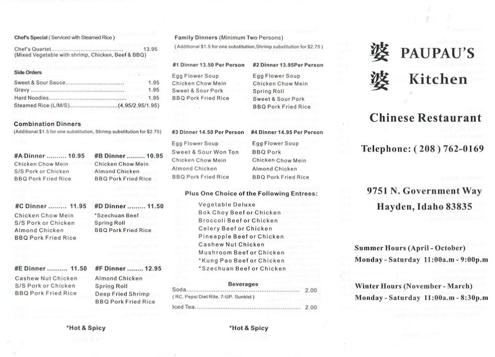 Welcome to Paupau's Kitchen, your go-to destination for authentic Chinese cuisine in Hayden Lake, ID. Located at 9751 N Government Way, we offer a delightful dining experience featuring traditional dishes like Kung Pao chicken and savory chow mein. Enjoy a relaxed atmosphere perfect for solo dinners or casual family outings. With options for dine-in, takeout, and delivery, we cater to every craving. Our accessible seating and family-friendly amenities, including high chairs, ensure everyone feels welcome. Visit us and savor our fresh flavors in a cozy, inviting setting. Reservations are appreciated; come taste the essence of Chinese cooking today!